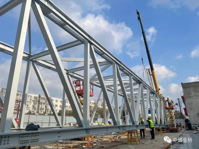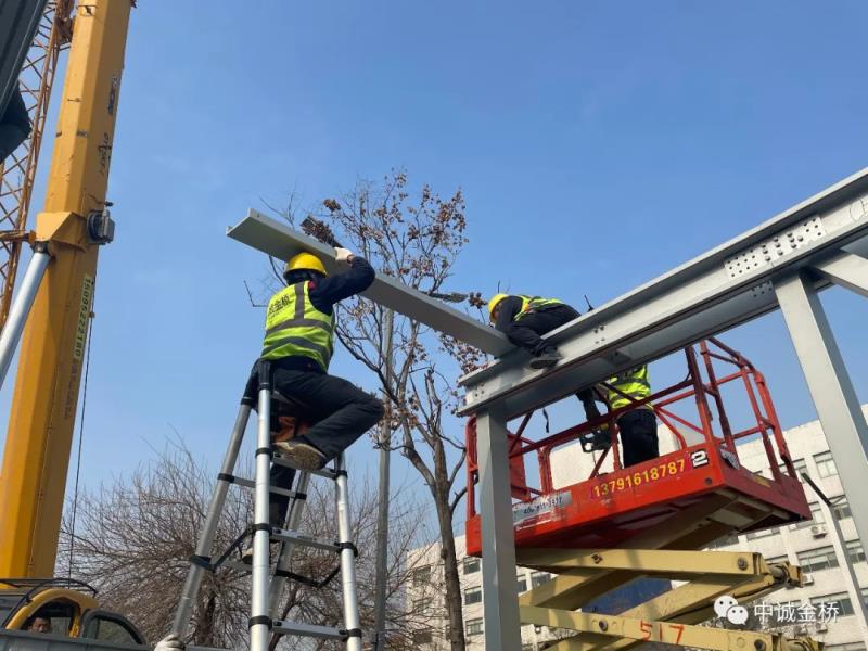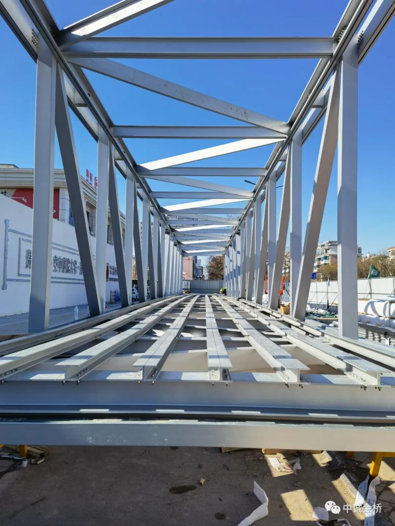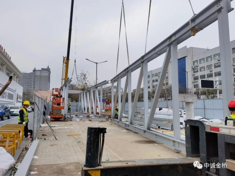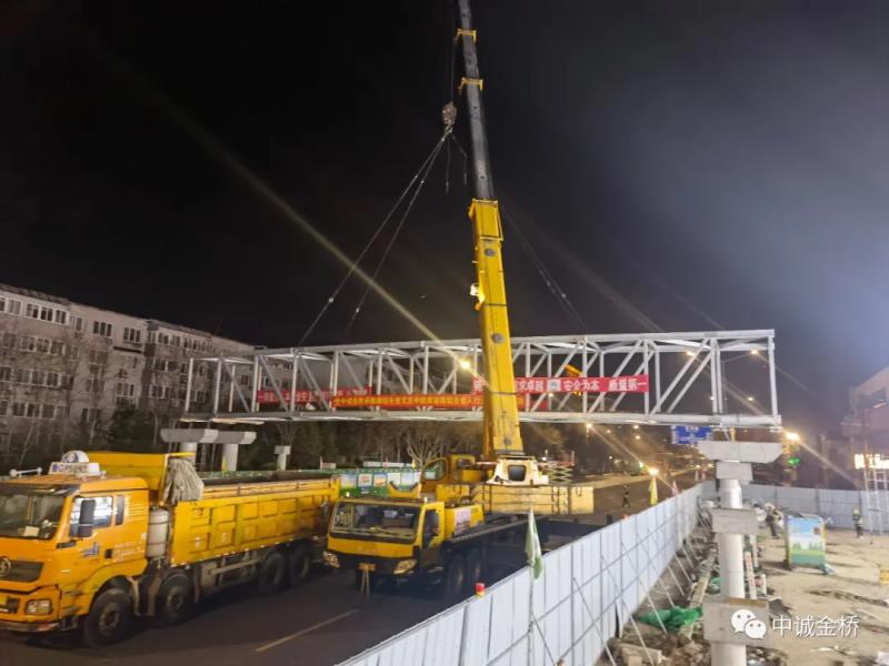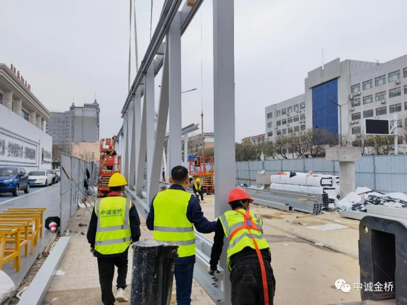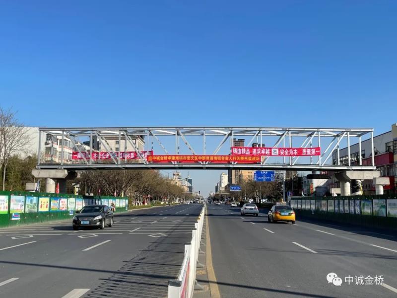 由中誠金橋工程有限公司承建的山東省濰坊市第一座鋁合金人行天橋“中新雙語南天橋”即將面世,主橋已于2021年12月3日凌晨2時(shí)45分完成了吊裝。